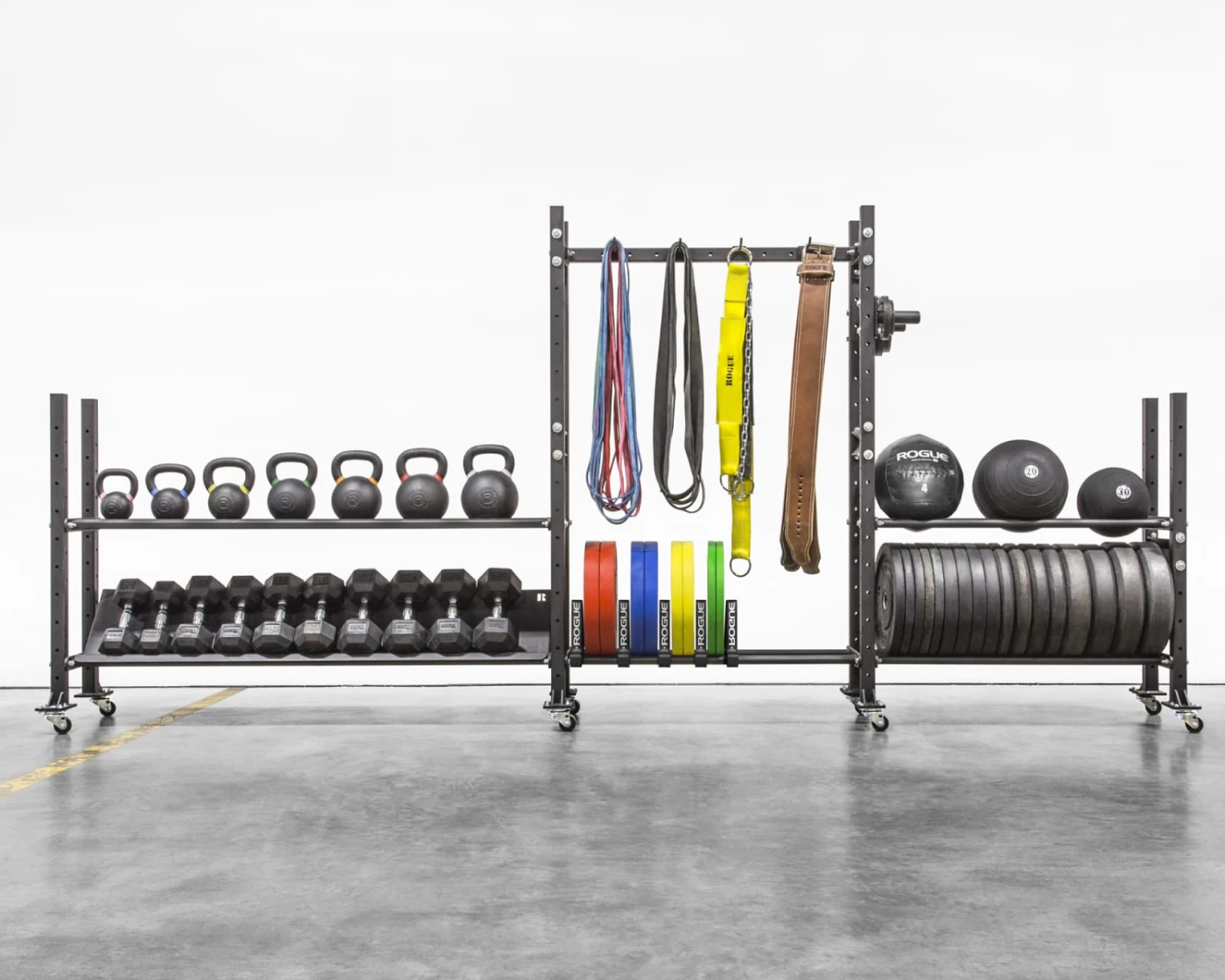 A great starting storage rack for any gym, this version of the Rogue Mass Storage System includes a pair of 43” long shelves—built to hold up to six medicine balls or more than 600LB in bumper plates. The 2-Tier unit is also fully customizable with a ton of optional add-ons, so you can swap out a bumper shelf with a specialized dumbbell or kettlebell tray, add wheels for convenient portability, include change plate pins for extra storage, and much more.
