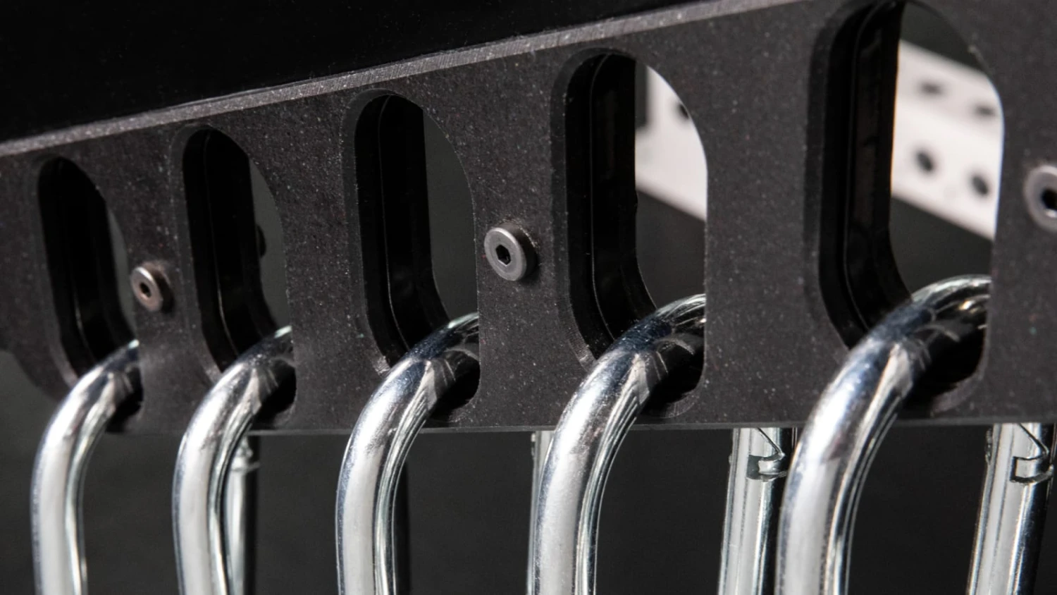 An installed Monster Chain Hanger will extend 17.5” from the mounting surface, making it ideal for setting up in the back 24” depth space of an RM-6 Monster Rack. The mounting holes are spaced 6” on center, and (2) black zinc Monster bolt assemblies are included standard. Each side of the Chain Hanger also includes ¼” thick UHMW plastic to help protect both the attached carabiner and the hanger itself from damage.
