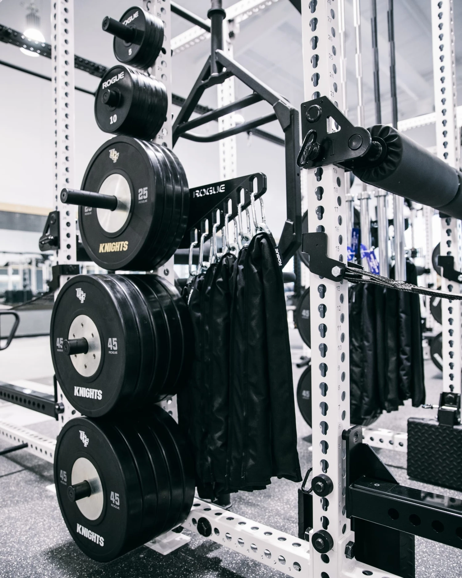 The Rogue Monster Chain Hanger is a bolt-on attachment designed exclusively for use with our 3×3” Monster Series racks and rigs. Constructed from 0.25” thick laser-cut and formed steel, the hanger is designed with a jog bend in the bracket, ensuring the superior strength needed to hold heavy lengths of chain. With a total of (6) 1” wide laser-cut carabiner slots, this simple rack add-on offers any gym a dependable, accessible, and organized new solution for multiple chain storage.