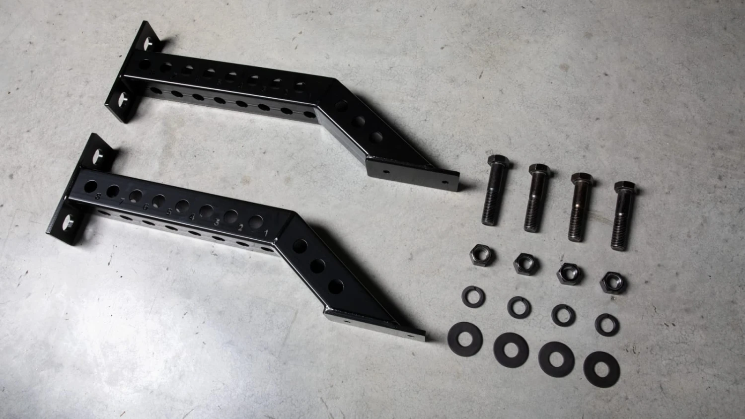 The 11-gauge steel Monster 30″ feet are sold here in pairs, and come with a 4-pack of 1” x 5” Monster Bolt Assemblies in your choice of a Black Zinc or Bright Zinc finish. The feet themselves have an MG Black finish, and include a series of 8 numbered holes (1” in diameter, spaced 2” on center) along the horizontal portion of the attachment, plus 3 additional holes along the angled portion.