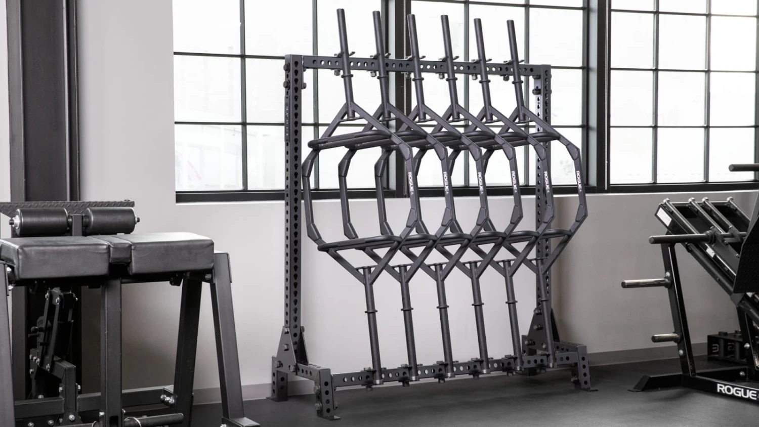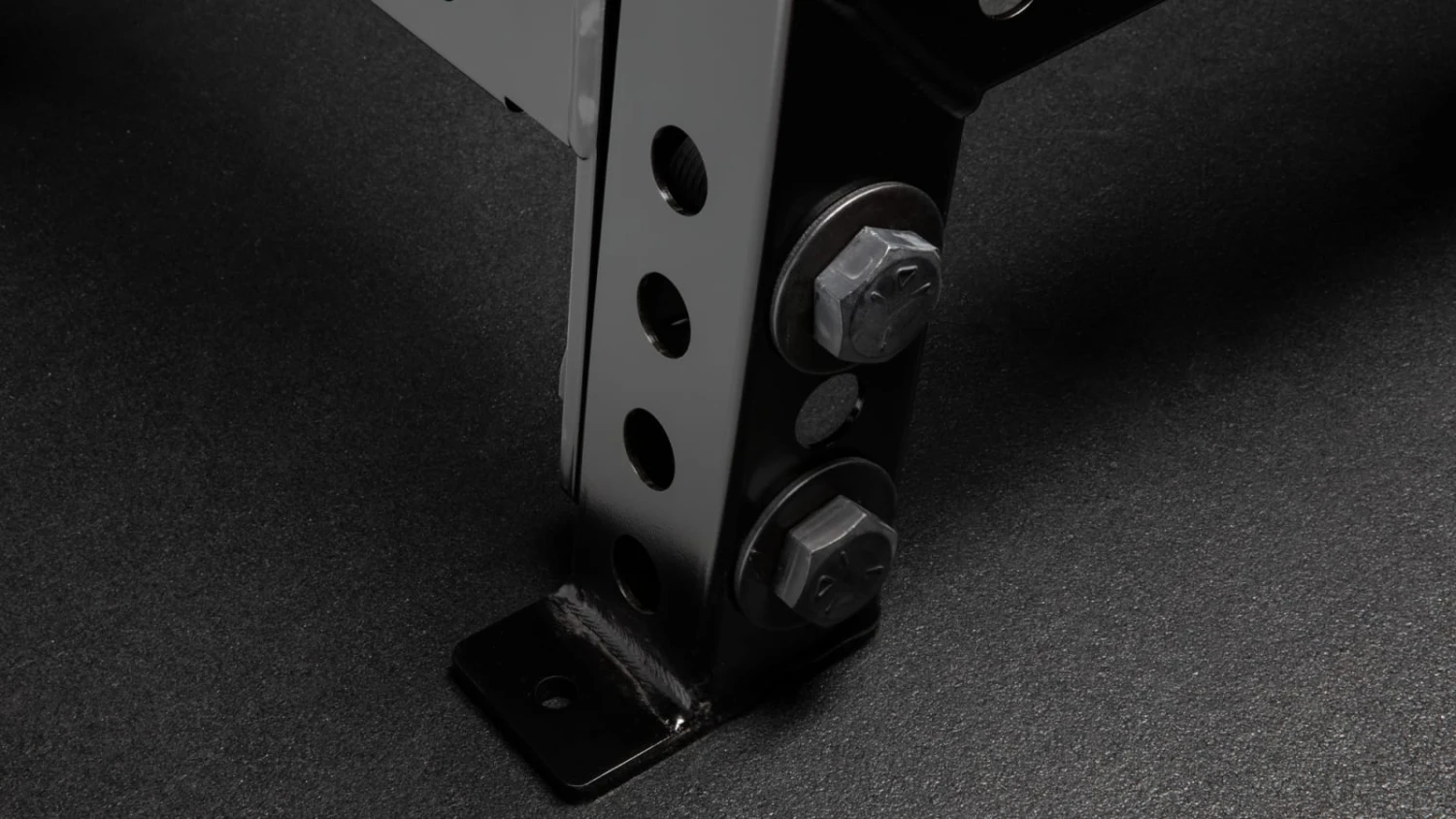 Made in the USA from 3×3” 11-gauge steel, this unit comes standard with 2 base feet, 2 uprights, 1 top crossmember, and either 1 (single-sided) or 2 (double-sided) bottom crossmembers. Once attached, the bottom crossmember(s) sits at a 10-degree angle to the top crossmember, allowing a racked barbell to rest in an upright, space-efficient, easily-accessible position.