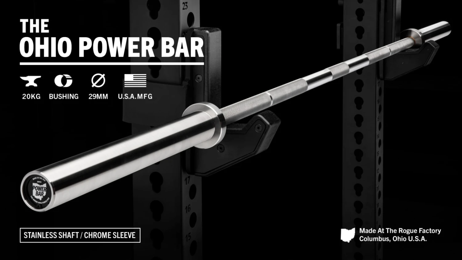 The 20KG Rogue Ohio Power Bar includes bronze bushings, a snap ring design, and a Stainless Steel shaft with Chrome sleeves.
