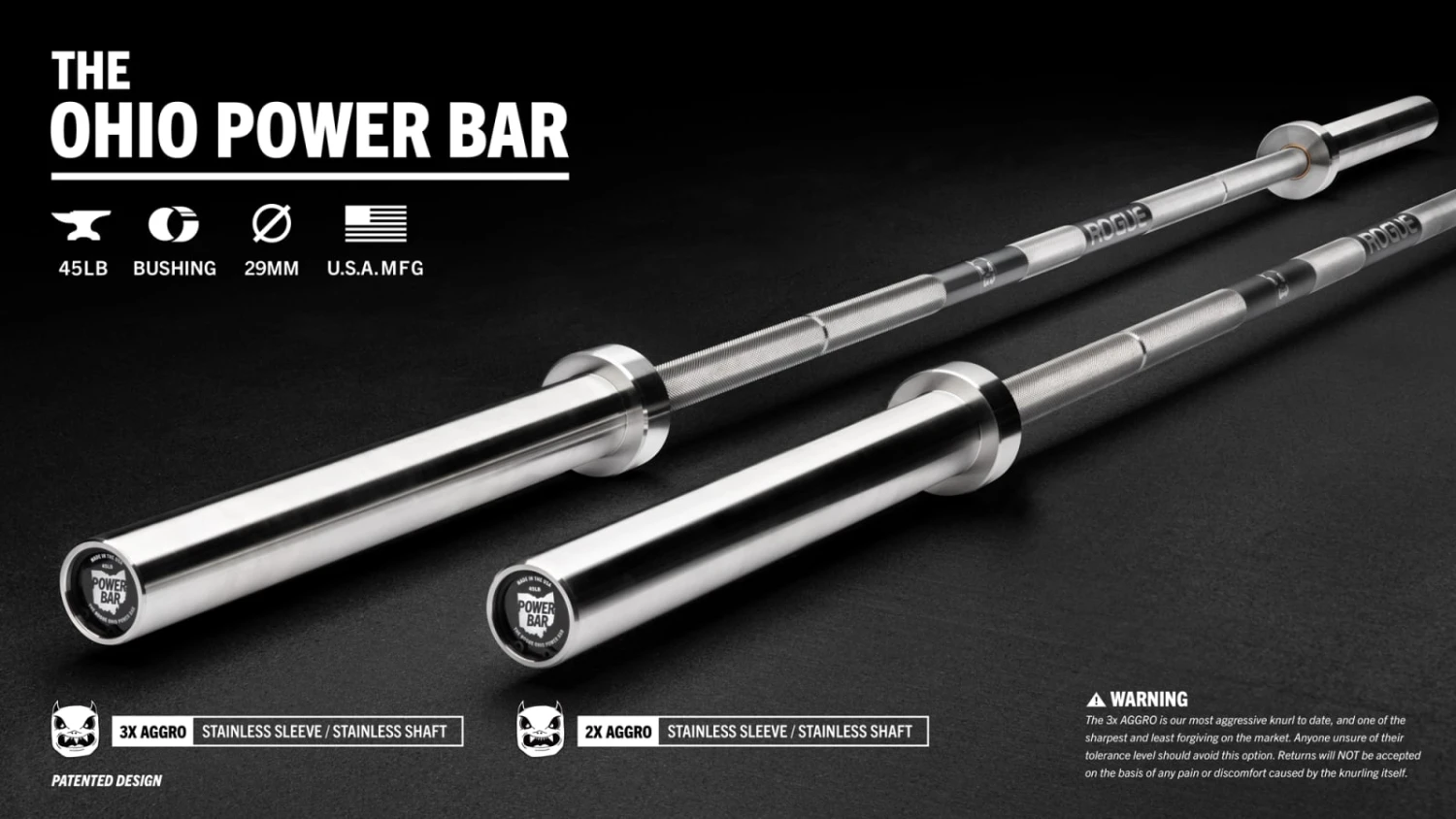 The AGGRO™ variations of our 45LB Ohio Power Bar are designed for lifters who want an even more aggressive knurl than the standard model. There are two options to choose from (2x AGGRO and 3x AGGRO), each utilizing advanced precision tooling to re-create the geometry of the original knurl pattern with added depth and more prominent peaks: