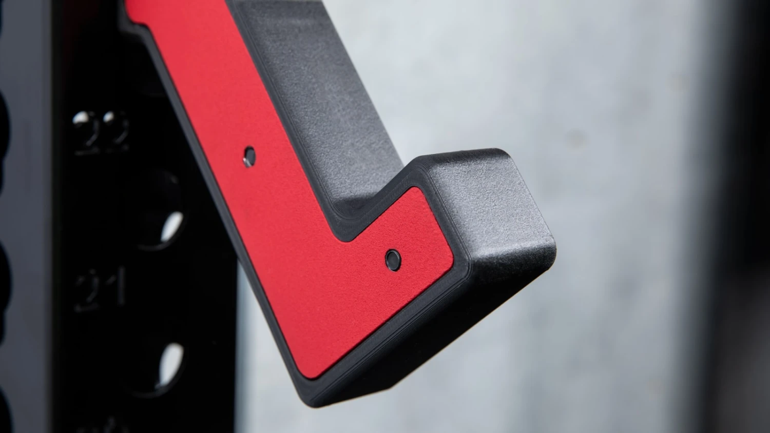 A cost-effective alternative to expensive, full-scale monolift units, the AM-2 Adjustable Monolift mounts to your rack’s uprights via a pair of 1/4” steel brackets (MG Black finish) and 1” detent pins. The 1.25″ wide jaw sections feature a Texture Red finish and are placed in recessed hook plastic, with an extended 8” of vertical space for re-racking (2” more than the previous model). A set of 3/8” thick steel counterweights (Texture Black finish) provide the necessary torque so that—when you lift the bar off the Monolift—the hooks will swing back approximately 5.5” toward the rack and stay there. This clears up enough extra space to go straight into your workout, and also enables safe re-racking, as the slanted angle of the unloaded hooks makes it easy to guide the bar in, activating the counterweights and moving the Monolift back into its original position.