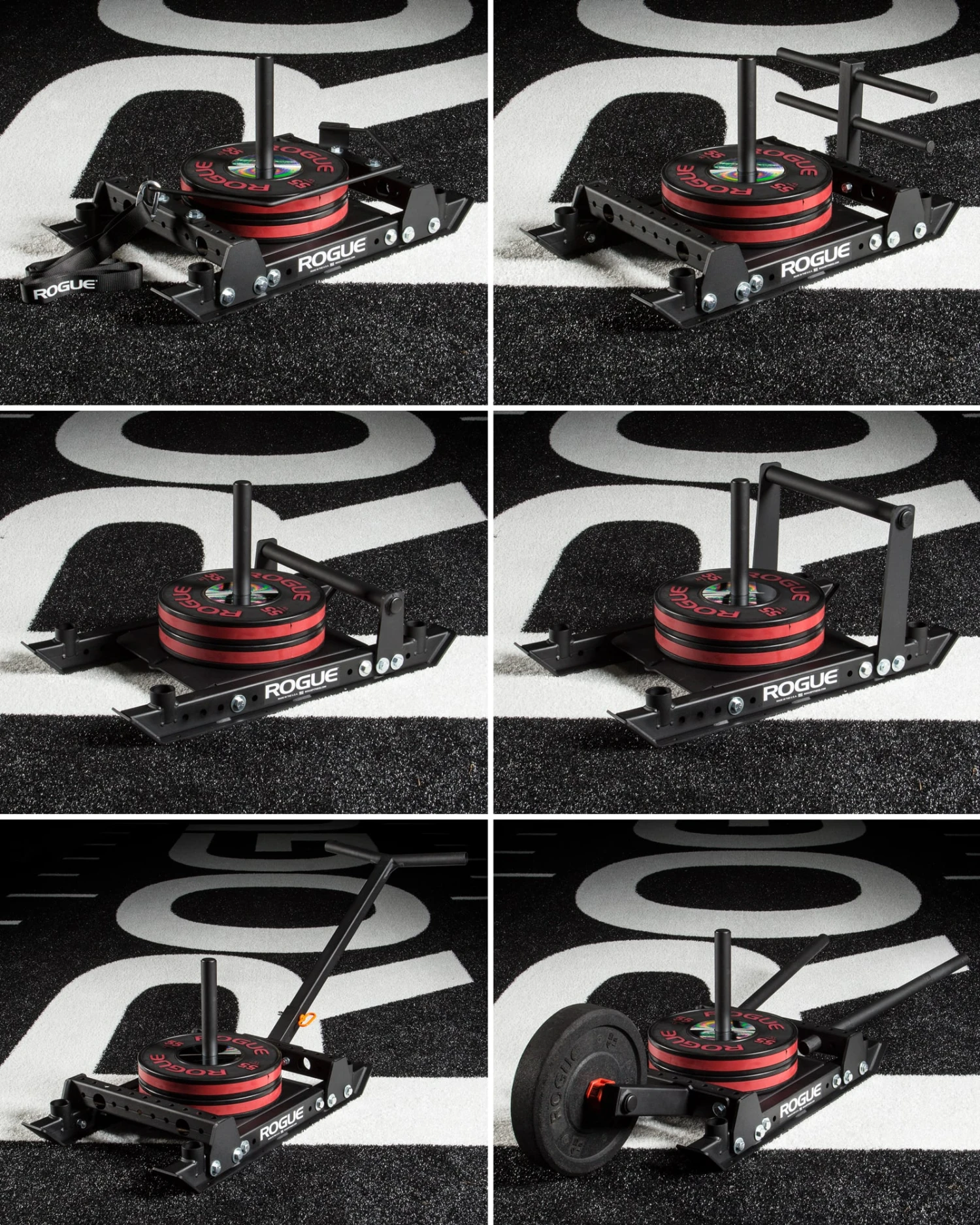 The CrossFit Games battled-tested Rogue Dog Sled comes standard with a quarter-inch steel base plate, 2×3” 11-gauge steel tubing, and a pair of 3-foot upright push bars designed to accommodate both high and low push stances. Compared to many prowler and speed sled designs, the portable Dog Sled has a smaller overall surface area, allowing you to get the most out of the plates that you own.