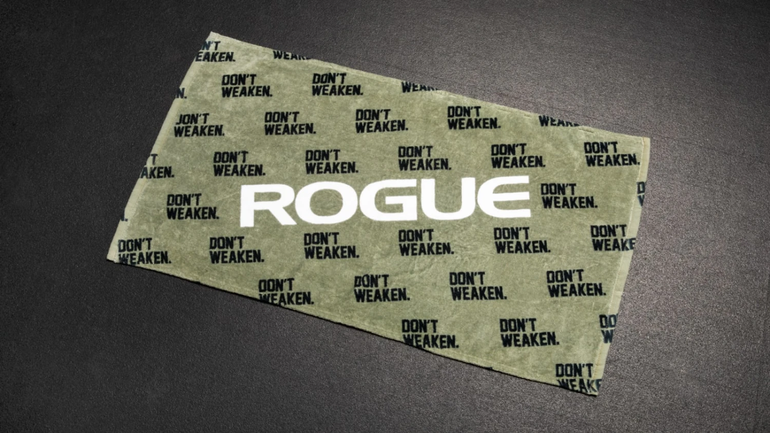 The towel is available here in white with the Rogue logo and “Don’t Weaken” mantra printed in black. See the purchase area for more color options.