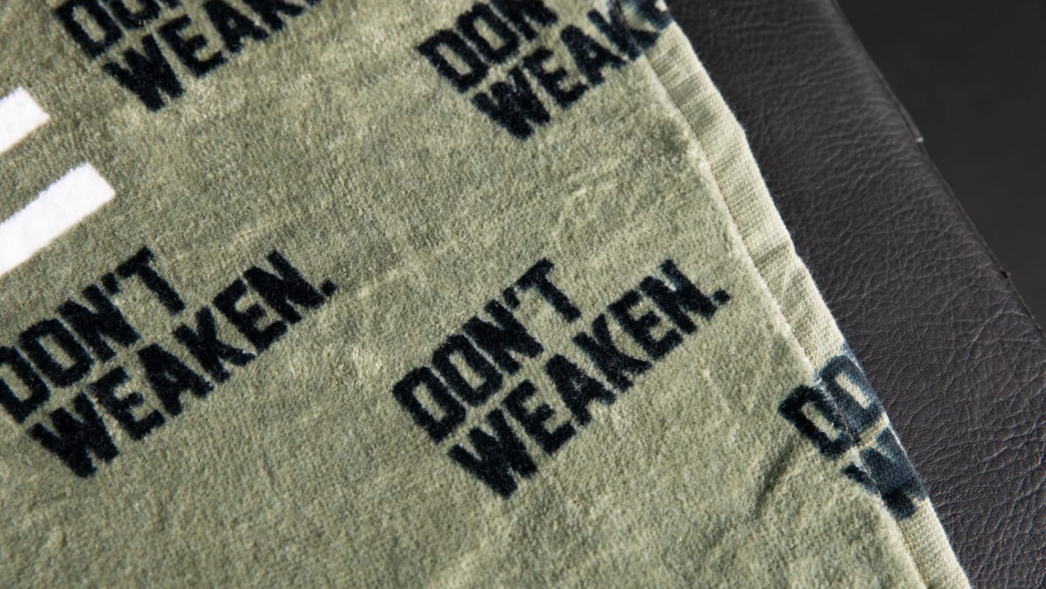 Rogue’s “Don’t Weaken” Gym Towel measures 17.75” x 31.5” and is made from a quality 100% cotton velour material. Stays soft through repeated uses; machine wash cold with like colors, tumble dry low.
