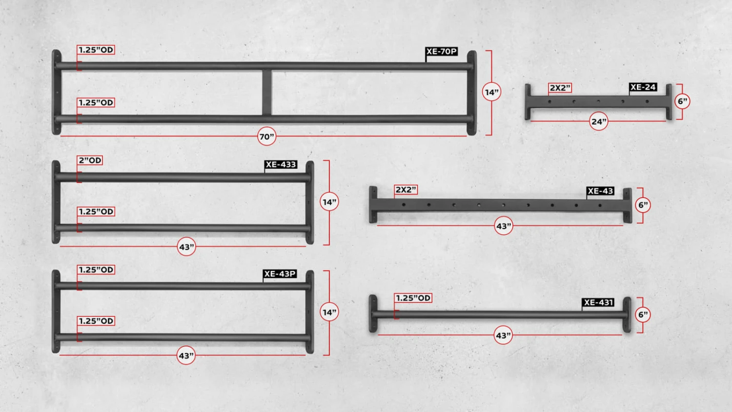 - XE-433 Echo 43” Fat/Skinny Pull-Up Bar (2” OD bar + 1.25” OD bar)