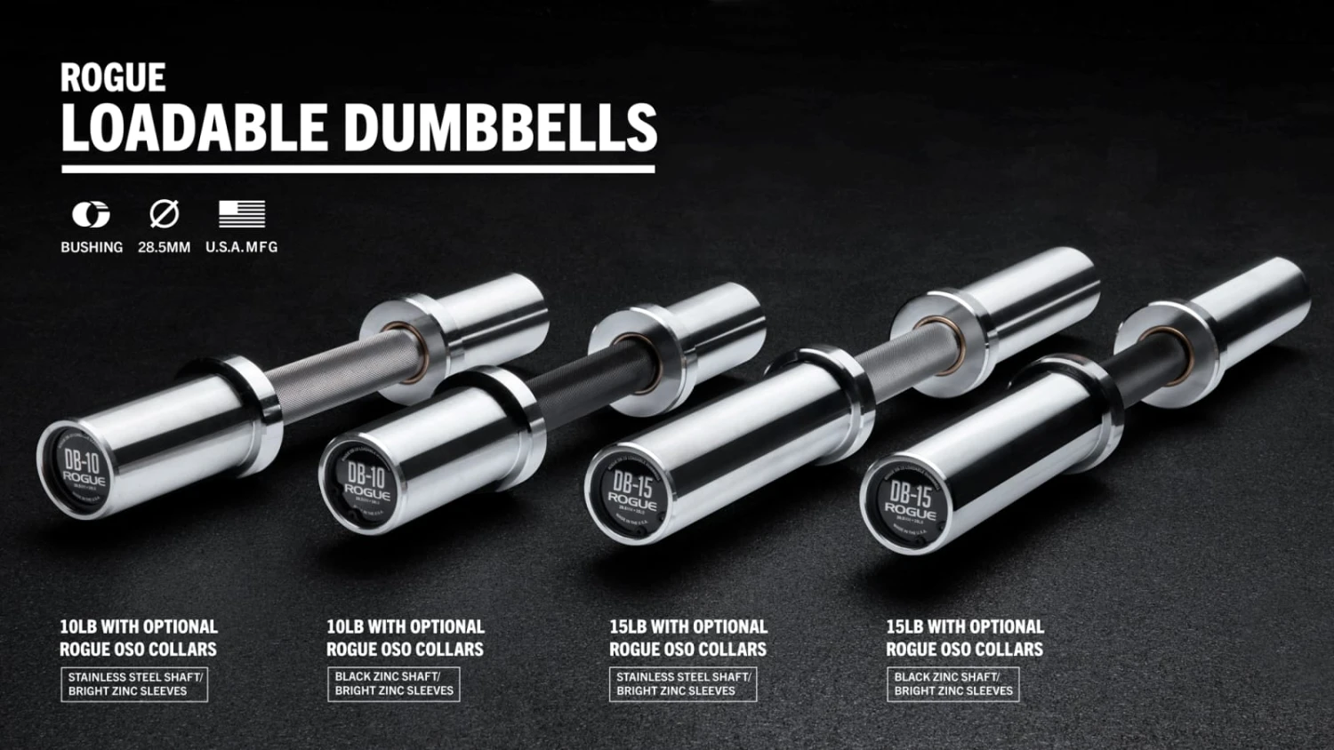 Rogue’s Loadable Dumbbells condense the key design and manufacturing elements of our full-size Ohio Bar into a compact, versatile new format. As an alternative to storing a complete set of traditional dumbbells in your gym, the DB-10 and DB-15 Dumbbell offer loadable sleeve lengths of 3.625” and 6.75” respectively—enabling athletes to make precision, custom weight adjustments in their dumbbell training using any standard Olympic plates as the increments.