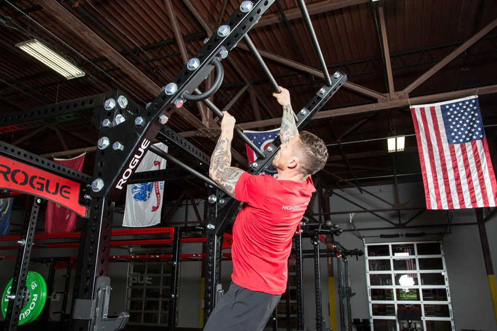 The Monster version of the Rogue Flying Pull-Up Bar mounts securely to the uprights of any existing Monster Series rig or rack (we also offer a separate Monster Lite version). Positioned at roughly a 45-degree angle, this all-in-one, 4-bar attachment functions like a heavy-duty pull-up ladder, demanding greater muscle recruitment and explosiveness from an athlete as they advance from rung to rung. The Flying Pull-Up Bar can also be used with gymnastic rings, adding the greater height often needed for better muscle-ups and other movements.