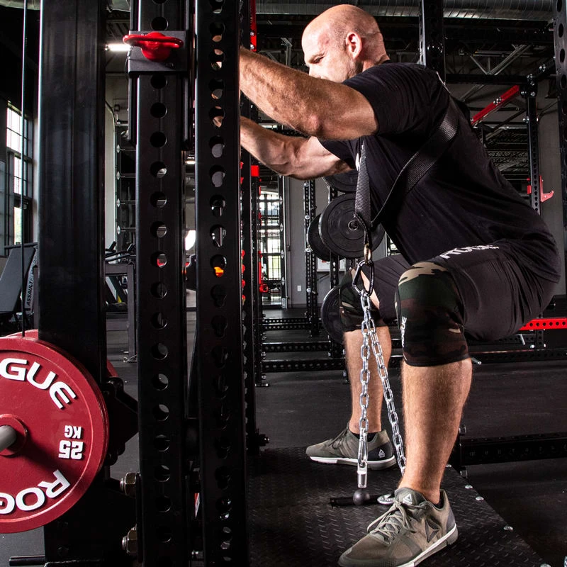 Using the Rhino Belt Squat + RM-3: Step onto the platform and strap on the Rogue Multi Belt around your hips. Upon standing up, the trolley will rise and disengage from the Rhino Horn. This allows users to then pull back on the handles and start squatting. Once the handles are pulled back, they will stay back until the user pushes the handles back towards the tower, allowing the horn to safely re-engage the trolley. With this special configuration with the RM-3, athletes can also incorporate barbell movements into their workout while using the Belt Squat at the same time.