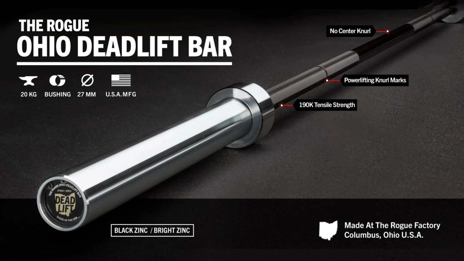 The Rogue Ohio Deadlift Bar is one of our finest, precision-engineered power bars to date, generating a higher amount of flex ideal for deadlifting. Machined and assembled in Columbus, Ohio, the ODB features a 190,000 PSI shaft with a comparatively thin diameter (27MM) and longer overall length (90.50″ is just within most powerlifting federation standards). This combination creates a bar that’s both easier to grip and designed for increased whip/flex when pulling. For many power lifters, that greater flex means being able to pull from a higher point before the plates break off the floor, potentially increasing the amount of weight that can be lifted in the process.