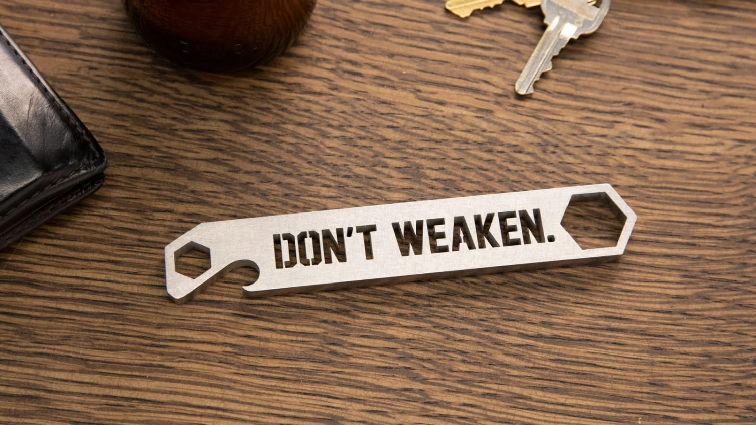 3/4” + 7/16” Don’t Weaken Wrench (Stainless): 6-1/8” long x 1” wide. Two-in-One design includes 3/4” wrench (for 1/2” hardware, such as our Echo line and Mass Storage units) and 7/16” wrench (for 1/4” hardware). Also includes bottle opener tab. Laser-cut “Don’t Weaken” slogan.
