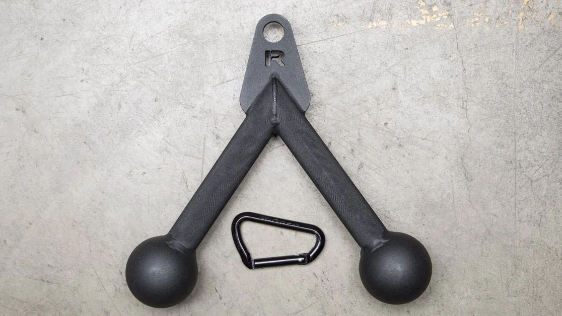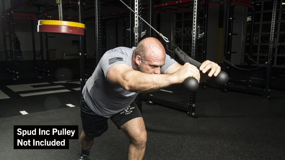 The Rogue Tricep Push Down Attachment adds a new, challenging grip element to your upper body training regimen. Compatible with the Spud Inc. Econo Tricep & Lat Pulley, this dual-handle, V-shaped attachment is made from knurled 1″ schedule 40 pipe, with 3″ diameter steel spheres welded to the end of each handle.