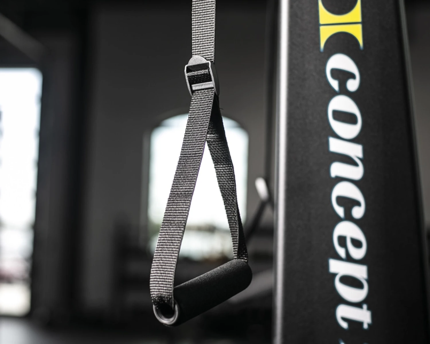 Designed specifically for use with the Concept 2 SkiErg—an industry leading Nordic skiing machine—the extension kit features (2) polypropylene webbing straps with a loop on one end and a handle on the other. The loops cinch around the bottom of the existing SkiErg grips, while the adjustable handle portion of the straps hang down to a max extension length of 28″ from the standard grips. Each 1.125″ (handle) diameter handle includes a foam outer layer for comfort, and can be easily tightened/loosened so that athletes with limited dexterity can still pull the device with little to no grip strength required.