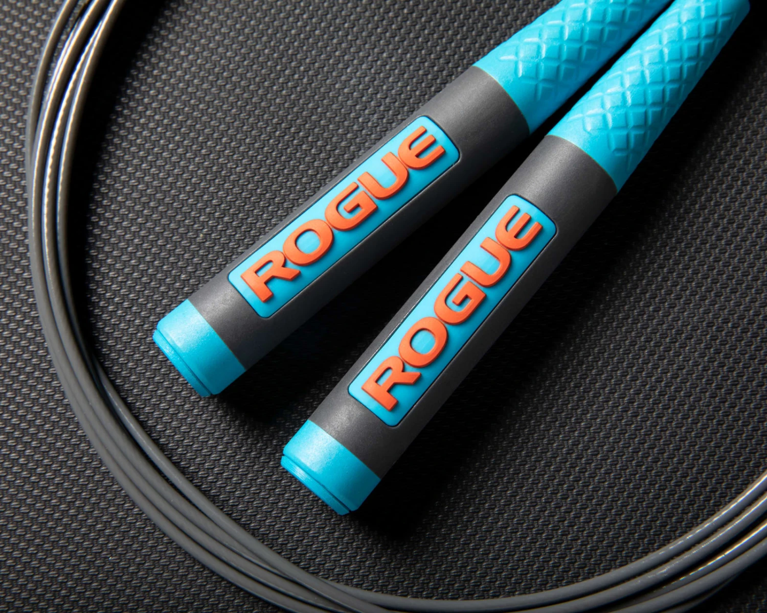Version 2.0 of the Spealler SR-1S Speed Rope also includes a new look, with a dark grey coating on the cable and overmold, laser blue handles, Rogue logo badges, and an exclusive endcap featuring the Chris Spealler “7-Fire” logo.